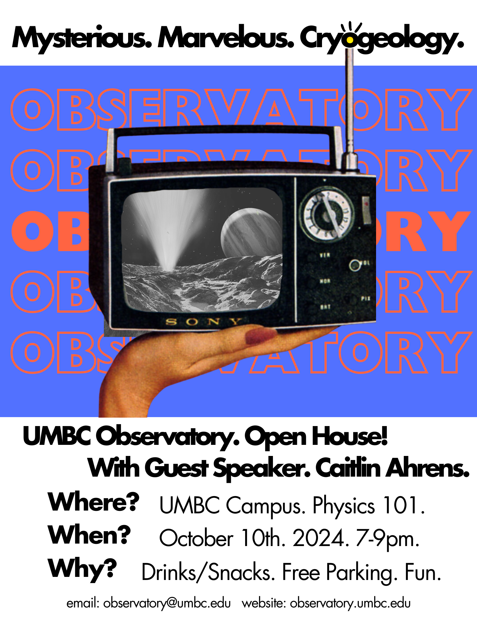 Did you know that UMBC's Observatory has one of the largest optical telescopes east of the Mississippi? Ever wanted to see it up close, but didn't know how? This academic year the UMBC community is invited to attend several UMBC Observatory Open House events. You'll have a chance to visit the control room and the dome to see the telescope itself, all following a lively discussion about a special topic in astronomy. Depending on the weather and sky conditions, the dome of the telescope may open for astronomical observations.
