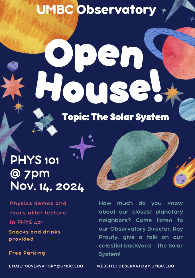 Did you know that UMBC's Observatory has one of the largest optical telescopes east of the Mississippi? Ever wanted to see it up close, but didn't know how? This academic year the UMBC community is invited to attend several UMBC Observatory Open House events. You'll have a chance to visit the control room and the dome to see the telescope itself, all following a lively discussion about a special topic in astronomy. Depending on the weather and sky conditions, the dome of the telescope may open for astronomical observations.